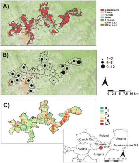 Map of the Cerová vrchovina protected landscape area: (A) mapped area of orchid species, (B) orchid richness in polygons, and (C) number of orchids predicted by MaxEnt based on occurrence of 9 most frequent species (see Methods).