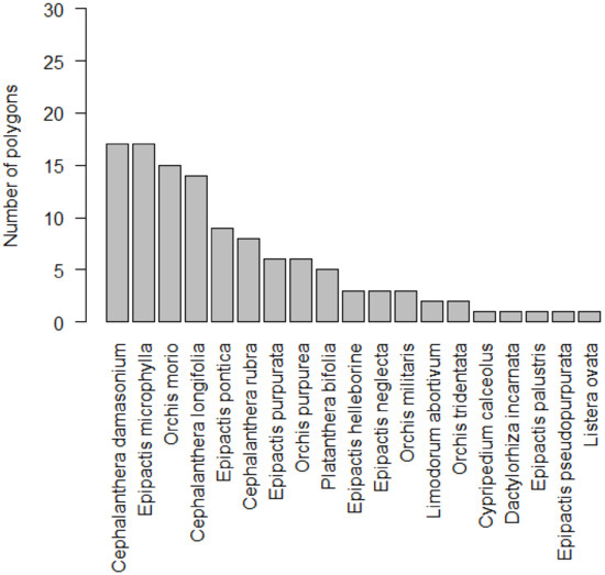 Altogether, 19 orchid species were found in the studied area (Appendix A). The most frequent species with occurrences in 17 polygons (~57%) were Cephalanthera damasonium and Epipactis microphylla, followed by Orchis morio (~50%) and C. longifolia (~47%), while 7 species, Limodorum abortivum, Orchis tridentata, Cypripedium calceolus, Dactylorhiza incarnata, Epipactis palustris, E. pseudopurpurata, and Listera ovata were found only in 1 or 2 polygons. The highest number of species was recorded within the Epipactis genus (7), followed by Orchis (4) and Cephalanthera (3) (Figure 2). Most polygons (~43%) contained 4–8 orchid species, but ~40% polygons contained 1 to 3 species. Only ~7% showed high species richness (9–12), and no orchid species was found in the rest of the polygons (10%; Figure 1B).