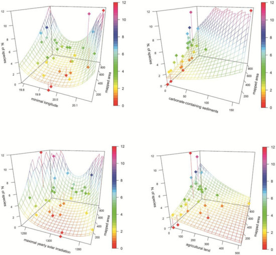 Association of orchid richness and selected statistically significant (p > 0.05) ecological variables (see Table 1). Mapped area, geological and land cover areas are given in number of raster layer cells (3″). Dots—study polygons; surface—model; vertical lines—deviation of polygon number of species from the model; colour scale—number of orchid species.