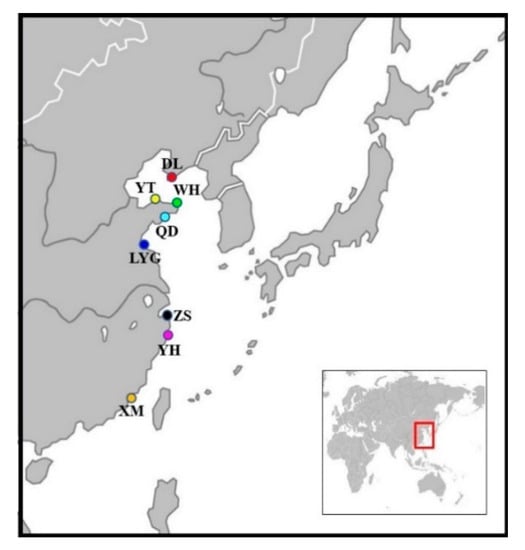 A total of 238 individuals of A. rubrolineatus were collected from eight localities across the coasts of China sea (Dalian, DL; Yantai, YT; Wehai, WH; Qingdao, QD; Lianyungang, LYG; Zhoushan, ZS; Yuhuan, YH; Xiamen, XM) (Table 1, Figure 1). All individuals were live trapped and identified based on morphological characters []. The abdomen muscle tissues were placed in absolute alcohol and transported to the laboratory, and then were stored at −80 °C until DNA extraction.