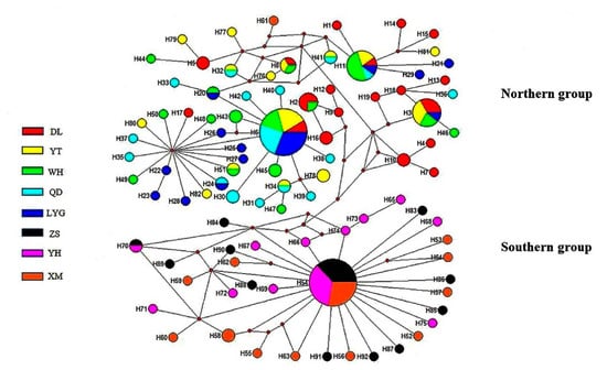 Among 92 haplotypes defined by the mitochondrial gene markers, no haplotype was shared by northern and southern populations (Table S2). In the phylogenetic trees, all 58 haplotypes from northern populations (YT, WH, DL, QD, LYG) grouped into one lineage, and 34 haplotypes from southern populations (ZS, YH, XM) grouped into another lineage (Figure 2). In the median joining network, haplotypes from northern and southern regions also distributed in two radiation clades, respectively (Figure 3).