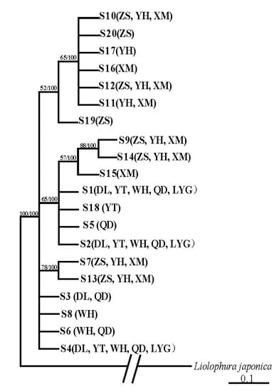 The genomic DNA of each individual was extracted from muscle tissue with a TIANamp Marine Animals DNA Kit (Catalog number: DP324-03, TIANGEN, Beijing, China) according to the manufacturer’s instructions, and was adjusted to 50 ng/μL. The gene segments of COI, 16SrRNA and 28SrRNA were amplified respectively with a polymerase chain reaction (PCR) technique using the primers listed in Table S1. The PCR reaction system was same as that described in Gong et al. []. The PCR procedures were listed in Table S1. A negative control without genomic DNA was included in each round of PCR to check for contamination, and all negative controls obtained no products. The PCR products were checked on 1.5% agarose gels stained by ethidium bromide and were visualized by ultraviolet transillumination (UVP, Upland, CA, USA). Then, the products were purified with a gel extraction kit (Sangon BioMedical, Shanghai, China) and sequenced (both directions) with an ABI 3730 XL automatic sequencer (Perkin-Elmer, Waltham, MA, USA) using an ABI PRISM BigDye Terminator Cycle Sequencing Ready Reaction kit (with AmpliTaq DNA polymerase FS, Applied Biosystems, Foster City, CA, USA).