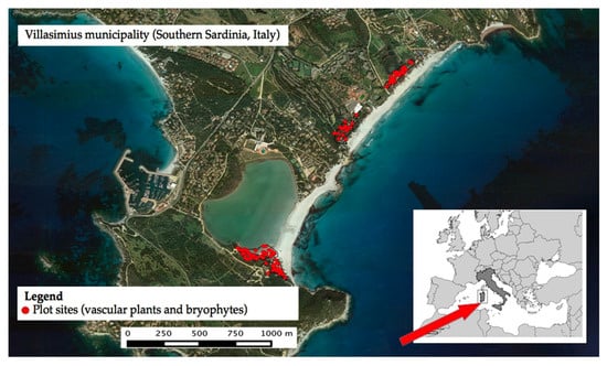 We delimited the main polygons of residual dune vegetation located along the 3 km long sand dune of Porto Giunco (Figure 1) and, to avoid the edge effect, we applied a 10 m internal buffer to the polygons. On the remaining area of about 10 ha (7 polygons), according to a simple random sampling, we selected one hundred 60 × 60 cm squared plots, a standard dimension to sample Mediterranean bryophytes [42,43,44]. In each plot we measured the presence and the cover abundance (in percentage) of vascular plants and bryophytes.