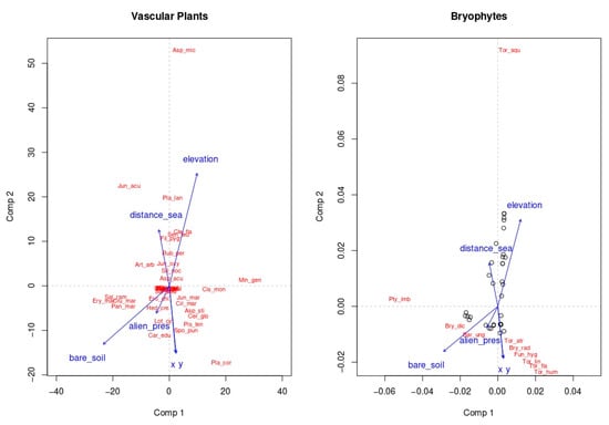 Vascular plant communities show a predictive power on the composition of bryophytes: altitude a.s.l. and bare soil cover are related with the variation of both communities in the ordination space. Vascular plant species are labelled as follows: Aca_sal--Acacia saligna; Aga_ame-Agave americana; Car_sp.-Carpobrotus sp.; Myo_tet-Myoporum tetrandrum; Opu_fic--Opuntia ficus-indica; Art_arb-Artemisia arborescens; Asp_acu-Asparagus acutifolius; Asp_sti-Asparagus stipularis; Asp_mic-Asphodelus microcarpus; Cak_mar-Cakile maritima; Cer_glo-Cerastium glomeratum; Cis_mon-Cistus monspeliensis; Cle_fla-Clematis flammula; Cri_mar-Crithmum maritimum; Cru_mar-Crucianella maritima; Cyp_cap-Cyperus capitatus; Cyp_kal-Cyperus kalli; Ely_far-Elymus farctus; Ero_chi-Erodium chium; Ery_mar-Eryngium maritimum; Fil_pyg-Filago pygmaea; Gal_par-Galium parisiense; Hed_cre-Hedypnois cretica; Hel_ita-Helichrysum italicum; Inu_cri-Inula crithmoides; Jun_acu-Juncus acutus; Jun_mar-Juncus maritimus; Jun_oxy-Juniperus oxycedrus var. macrocarpa; Jun_pho-Juniperus phoenicea; Lag_ova-Lagurus ovatus; Lim_ret-Limonium retirameum; Lop_pub-Lophochloa pubescens; Lot_cyt-Lotus cytisoides; Min_gen-Minuartia geniculata; Ole_syl-Olea sylvestris; Pan_mar-Pancratium maritimum; Par_str-Parapholis strigosa; Pis_len-Pistacia lentiscus; Pla_bel-Plantago bellardii; Pla_cra-Plantago crassifolia; Pla_lan-Plantago lanceolata; Pol_mar-Polygonum maritimum; Rub_per-Rubia peregrina; Sal_ram-Salicornia ramosissima; Sal_kal-Salsola kali; Sal_sod-Salsola soda; Sar_fru-Sarcocornia fruticosa; Sca_mar-Scabiosa maritima; Sen_leu-Senecio leucanthemifolius; Sen_vul-Senecio vulgaris; Sil_nic-Silene nicaeensis; Sil_noc-Silene nocturna; Spo_pun-Sporobolus pungens; Sti_cap-Stipa capensis; Tol_vir-Tolpis virgata. Bryophytes are labelled as follows Bar_ung-Barbula unguiculata; Bry_dic-Bryum dichotomum; Bry_rad--Bryum radiculosum; Fun_hyg-Funaria hygrometrica; Mic_dav-Microbryum davallianum; Pty_imb-Ptychostomum imbricatulum; Tor_fla-Tortella flavovirens; Tor_hum-Tortella humilis; Tor_squ-Tortella squarrosa; Tor_atr-Tortula atrovirens; Tor_lin-Tortula lindbergii.