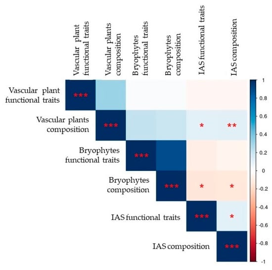 Species functional traits for both plant communities and bryophytes were used to calculate pairwise functional distances among plots using the package “adiv” [57]. Specifically, considering the different nature of functional traits available (quantitative, ordinal, nominal), we computed two functional dissimilarity matrices (one for vascular plants and one for bryophytes) using a modified version of the Gower distance allowing for the treatment of various statistical types of variables (for more details about the methodology see [58]). To investigate the strength of the correlations among compositional and functional diversity of vascular plants vs. bryophytes and the correlations among compositional and functional diversity of invasive alien vascular plant species vs. bryophytes, we used the r Pearson’s correlation coefficients testing their significance with Mantel tests (based on the null distribution of the r Pearson’ correlation coefficient on 9999 permutations, selected α level = 0.05). Partial Mantel tests were also performed testing the same relationships described above but using a conditional distance matrix based on the Euclidean distances of the plot variables (i.e., coordinates, altitude, distance from the sea line, vegetation physiognomy).