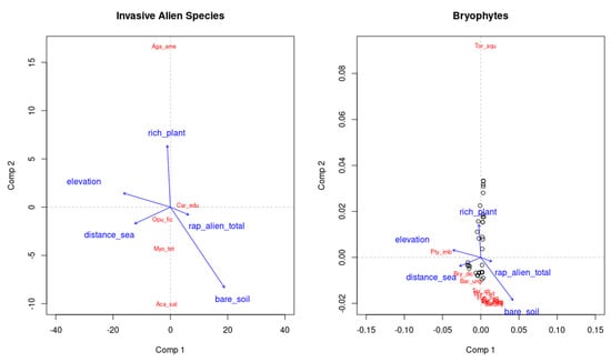 Furthermore, predictive co-correspondence analysis (Co-CA, see [59,60] for a full description of this method), was used to quantify the strength of vascular plant community data in predicting bryophytes species composition. A second predictive Co-CA was also performed to explore if and how IAS vascular plant composition influences (positively or negatively) the composition of bryophytes. A leave-one-out cross-validatory fit percentage was estimated, for each Co-CA, to select the minimal adequate predictive ordination axes. Cross-validatory fit > 0 implicitly validates the model, indicating that prediction is better than the one obtained under the null model [60]. Hence, a permutation test for predictive Co-CA models were performed to assess the significance of each ordination axis (statistical significance level selected α = 0.05, 999 permutations); in addition, environmental variables were fitted onto Co-CA ordination axes aiming at understanding the meaning of axes in term of the underlying ecological gradients. The “envfit.coca” function in the “vegan” R package [61] was used at this scope and the associated goodness of statistic fit was the squared Pearson correlation coefficient (r2).