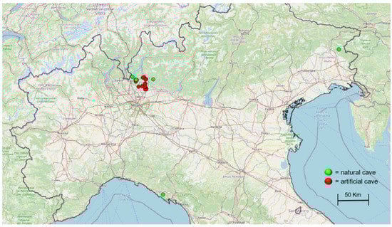 To obtain preliminary information on caves (i.e., location, development) we used the data from the cave cadasters of Lombardy and Liguria. The artificial subterranean sites considered here were artificial subterranean springs, draining galleries of catchment (the so called ‘bottini’), and artificial mines. To localize the artificial subterranean sites, we used information available in studies on subterranean fauna [35] and local information on mine activity.