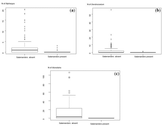 Boxplots of relationships between the occurrence of fire salamander larvae and abundance of the stygobiont target taxa: (a) amphipods of the genus Niphargus; (b) planarians of the genus Dendrocoelum; (c) isopods of the genus Monolistra.