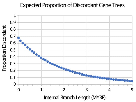 There is indeed evidence of an explosive radiation of Neoaves that is independent of the fossil record or timetrees. The discordance among transposable element (TE) insertions [,,,], molecular characters for which homoplasy is very limited (but potentially non-zero []), provides evidence for extensive conflict among gene trees at the base of Neoaves. That conflict is consistent with the hypothesis that there was extensive incomplete lineage sorting (ILS) near the base of the neoavian tree that has no doubt contributed to the difficulty of confidently resolving branching order among major lineages of Neoaves (e.g., [,,]). Parsimony analyses of indel (insertion–deletion) data also provided evidence for extensive ILS associated with the short branches at the base of the neoavian tree (see Figure 3e,f in Jarvis et al. []). Of course, conflicts among gene trees estimated from nucleotide sequences have long been appreciated [,,,,,,], and this conflict has also been interpreted as evidence for ILS. However, conflict among gene trees can be driven by error in gene trees; in contrast, conflict among low-homoplasy genomic characters (i.e., rare genomic changes) provide much more direct evidence for ILS (reviewed by Braun et al. []). Gene tree discordance due to ILS decreases exponentially as branch lengths increase (Figure 1). However, both time and effective population size (Ne) are critical components of coalescent branch lengths (CBLs). Thus, the evidence that the branches at the base of Neoaves in the avian species tree are characterized by large amounts of conflict due to ILS provides direct evidence that those branches represent extremely short periods of time.