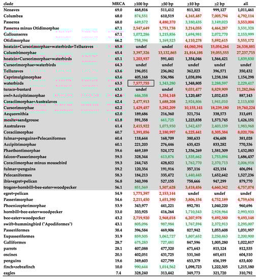 - Jarvis, E.; Mirarab, S.; Aberer, A.J.; Li, B.; Houde, P.; Li, C.; Ho, S.Y.W.; Faircloth, B.C.; Nabholz, B.; Howard, J.T.; et al. Phylogenomic analyses data of the avian phylogenomics project. GigaScience 2015, 4, 4–9. [Google Scholar] [CrossRef]