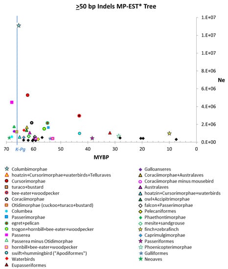 It is possible that our Ne estimates are within the range of estimated Ne for current or recent populations, but that our sample of branches later than 56 MY is insufficient to detect a representative range of Ne. Nadachowska-Brzyska et al. [] reported Pairwise Sequentially Markovian Coalescent (PSMC)-estimated Ne of current populations with a median of 112,451 and upper quartile of 305,674, but with much higher estimates for Pleistocene than current populations for most species and up >4 million for some. Foremost, we note that both of our studies examined relatively few species (the same 48), which themselves may not fully represent the variation of Ne in either extant or extinct birds. We recovered Ne estimates an order of magnitude higher on four branches (i.e., Columbimorphae, Cursorimorphae, Cursorimorphae + waterbirds + Telluraves, and hoatzin + Cursorimorphae + waterbirds + Telluraves on the MP-EST* tree). The extent to which a transient spike in Ne is compelling evidence of density compensation in response to ecological release is if it is observed in lineages that experienced radiation. This is not to say that ecological release necessarily results in radiation or that a given radiation was necessarily adaptive. Ornithologists have identified the neoavian clade as a radiation so explosive that some divergences may represent hard polytomies [,]. Thus, it is notable that the Neoaves branch did not yield unusually high Ne estimates, although all six of the first divergences within Neoaves were within the upper quartile based on one or more indel size class datasets (Figure 2, Table 2, Tables S4 and S12). Since the most recent common ancestor (MRCA) of Neoaves somewhat predates the K-Pg [,,], it therefore may not be expected to bear the signature of ecological release due to that event. Ecological opportunity would appear to have presented itself to descendent lineages instead.