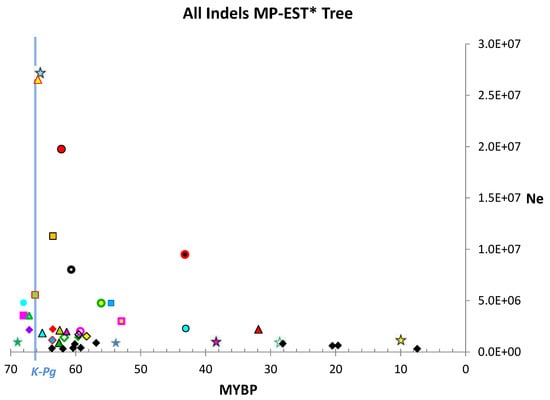 Estimated Ne of “all indels” size partition plotted on MP-EST* timetree time scale. There is a spike in some Ne estimates near the K-Pg boundary, similar to that observed in analysis of only long indels, which are less homoplasious but much less numerous. Symbols as in Figure 3. MYBP = million years before present.