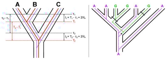 The multispecies coalescent can lead to a problem with the potential to be more pernicious than the standard problems that apply to all relaxed clock analyses (Figure 5); this issue could have an impact on the analyses we have undertaken in this study. Specifically, we would like to assess the lengths of internal branches that reflect the times between speciation events (labeled τ1 and τ2 in the left part of Figure 5), but molecular divergence times actually predate the species divergence times [,]. When nuclear loci are used for dating, it reflects a mixture of trees with different divergence times that predate the actual speciation time []; herein, we use T1 and T2 to indicate the mean coalescent times for gene trees that are concordant with the species tree (exemplified by the red gene tree in the left part of Figure 5). This issue may not be that problematic when Ne is constant and internal branches are relatively long because differences between the means of the molecular divergence times (T2–T1) should be relatively close to the desired parameter (i.e., the difference between speciation times; τ2–τ1). However, this illustration should also make it clear that changes in Ne can alter estimates of T2–T1) precisely because those changes will have an impact on the average coalescent time. For example, t2 (T2–τ2) would be larger than t1 (T1–τ1) if Ne for the common ancestor of all three hypothetical taxa was larger than Ne for the common ancestor of taxa A and B (and vice versa). Thus, variation in Ne has the potential to distort branch lengths. In general, increased Ne on the internal branch (i.e., the branch uniting species A and B in the tree to the left of Figure 5) will reduce the estimated branch length, whereas reduced Ne will increase the estimated branch length.
