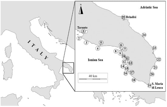 Map of the Salento Peninsula indicating the sampling localities; the box highlights the Salento Peninsula at a higher magnification. Numbers refer to sampling stations reported in Table 1.