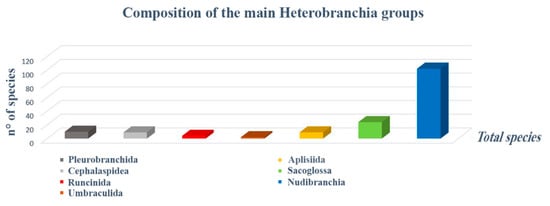 Comparison between the main heterobranch groups; the graph shows the comparison between the total species of the Salento Peninsula, clustered into the main groups.