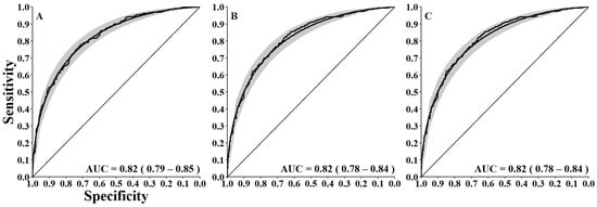 Response operator curves (ROC) for the top and global detection model for the Eastern Massasaugas surveys at Carlyle Lake, Clinton County, Illinois from 2002–2014 where A = the post hoc model, B = the land manager model, and C = the global model..