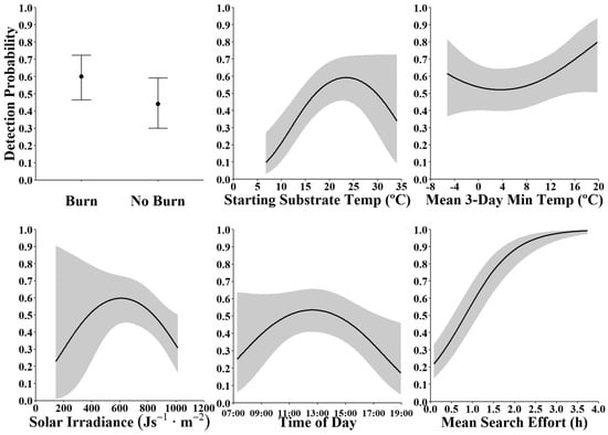 The six variables comprising the post hoc model illustrates that we surveyed under a range of conditions (Table 4, Figure 2). Of our total surveys, 383 occurred in burned/semi-burned habitats and 330 occurred in burned habitats. Surveys were completed under conditions centered with a daRad ≈ 800 J/s·m2, rTime ≈ midday, sSUB ≈ 18 °C, m3Min ≈ 6 °C, and mEffort ≈ 50 min (Table 4; Figure 2).