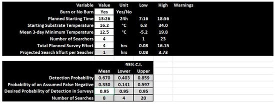 We used the Manager model to construct a tool in Microsoft Excel, which allows user input Burn, planned starting time (rTime), sSUB, m3Min, and mEffort. For flexibility, we allowed mEffort to be user input from nSearch and planned tEffort. We designed the detection tool to provide the estimates and confidence intervals for the detection/non-detection probabilities and their associated 95% confidence intervals. To obtain the number of searches, we modified the following equation from MacKenzie and Royle [28]: