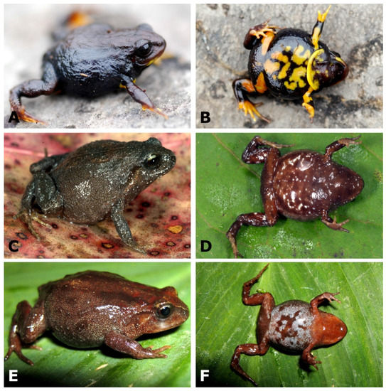 - Padial, J.M.; Grant, T.; Frost, D.R. Molecular systematics of terraranas (Anura: Brachycephaloidea) with an assessment of the effects of alignment and optimality criteria. Zootaxa 2014, 3825, 1–132. [Google Scholar] [CrossRef]