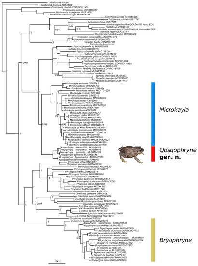 Bayesian maximum clade-credibility tree for 106 species of Holoadeninae (Terrarana) based on a 2646-bp concatenated partitioned dataset (fragments of genes 16S, 12S, COI, RAG1, and Tyr), highlighting the relationships of the three genera Bryophryne, Microkayla and Qosqophryne gen. n. Posterior probabilities are indicated at each node. The frog illustrated here is Qosqophryne gymnotis, paratype MUSM 24542 (photograph by A. Catenazzi).