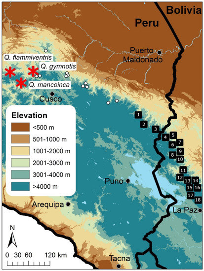 Type localities of frogs in the genera Bryophryne (white circles, species details not shown), Microkayla (squares) and Qosqophryne gen. n. (red asterisks) in southern Peru and northern Bolivia. The known distribution range of these frogs is limited to the type locality and immediate surroundings. For species of Microkayla: (1) M. boettgeri; (2) M. chilina; (3) M. chapi; (4) M. katantika; (5) M. chaupi; (6) M. melanocheira; (7) M. colla; (8) M. kallawaya; (9) M. guillei; (10) M. saltator; (11) M. iani; (12) M. illampu; (13) M. ankohuma; (14) M. condoriri; (15) M. teqta; (16) M. huayna; (17) M. chacaltaya; (18) M. wettsteini. The map does not include seven species of Microkayla distributed in central and southern Bolivia (type localities outside the limits of this map).