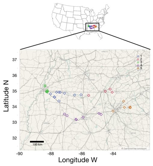 Map of sampling sites across the historic range of kudzu infestations in the Southeastern United States. Sampling sites are color coded based on k-means clustering into five broad location clusters used for analysis.