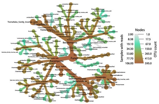 Taxonomic distribution of fungal endophytes within sampled kudzu leaves, as visualized using the program Metacoder, resolved to the family level. Nodes are sized proportional to OTU abundances for each taxonomic rank, and OTUs that are more common throughout our samples fall toward the brown end of the color gradient.