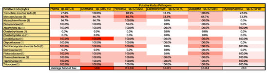 Heat map indicating the percentage of significant endophytic OTUs within each family (rows; total number of tested OTUs with families are shown parenthetically) that are significant and positively associated with pathogens (columns, with OTU number presented parenthetically) Average Kendall’s tau correlation coefficients for all significant correlations are used for color demarcation (see last row).