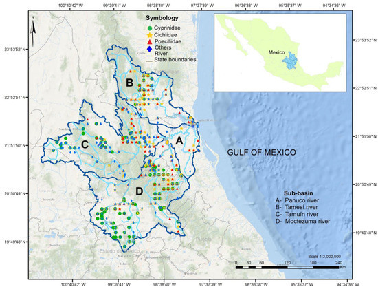 The Pánuco basin spans a large (97,196 km2), ecologically and geographically diverse area. The mainstem of the Pánuco runs generally SW–NE for 510 km from its source to the Gulf of Mexico [24]. The Pánuco runs from the central Mexican plateau and the Sierra Madre Oriental, along rugged terrain to reach a relatively short coastal plateau. It drains the states of Tamaulipas, San Luis Potosí, Hidalgo, Querétaro, México, Guanajuato, and Veracruz [7] (Figure 1). As classified by the Mexican Institute for Geography and Statistics (INEGI), the National Institute of Ecology (INE) and the National Water Commission (CONAGUA), the Pánuco includes four sub-basins :(A) Río Pánuco, (B) Río Tamesí, (C) Río Tamuín, and (D) Río Moctezuma [25] (Figure 1). The Río Pánuco sub-basin is in the states of Tamaulipas and Veracruz [16]; it is the lowest portion of the Pánuco Basin and is comprised of the outlet of the San Juan and Tula rivers downstream from the Zimapán Dam on the Moctezuma and the confluence of the Tamuín River. The Rio Tamesí (originates with the name of Guayalejo river) sub-basin flows NW–SE in the states of Tamaulipas, San Luis Potosí, and Veracruz [7,24]. The Río Tamuín starts in the state of San Luis Potosí after the confluence of the Verde and Santa María rivers, and includes the Gallinas, Tamasopo, El Salto, and Valles rivers. The Calabazas and Los Hules rivers are also located in this sub-basin. The Moctezuma sub-basin includes the San Juan, Extoraz (Tolimán and Victoria), Amajac, and Tempoal rivers and drains the states of Hidalgo, Querétaro, México, San Luis Potosí, Guanajuato, and Veracruz [7]. Administratively, this sub-basin includes the once endorheic Mexico City valley as part of the Moctezuma; this valley has not been included in our study.