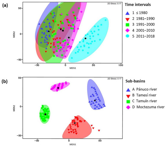 Multidimensional scaling (MDS) comparison (Jaccard values of similarity) of Pánuco River ichthyofauna between (a) time intervals and (b) sub-basins (see methods for details). Icons in black represent the centroids for each group with a similar shape.