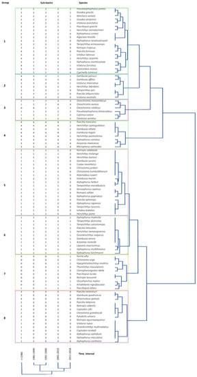 Dual grouping analyses resulted in eight distinct groups. Group 1 had species found in more than two sub-basins in the first four intervals and whose presence in the last interval declined. Group 2 was formed by species present in more than three sub-basins in the first three time intervals and then declined after the fourth time interval. Fish species in group 3 were rare in the first intervals and were found in more than three sub-basins by the fourth and fifth time intervals. All fish species in group 4 were present in more than three sub-basins in all intervals. Group 5 was formed by species exclusive to each sub-basin, which were present in the first three intervals, but absent in the last one. Fishes in group 6 were present throughout all time intervals. Group 7 was formed by fish species present in the last three intervals only. Finally, group 8 included species recorded in time interval 1, but absent thereafter (Figure 3; Table 1).