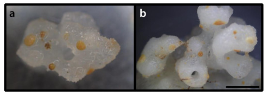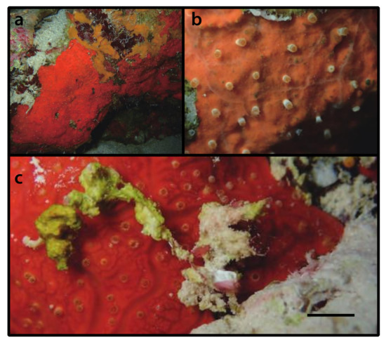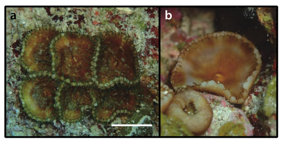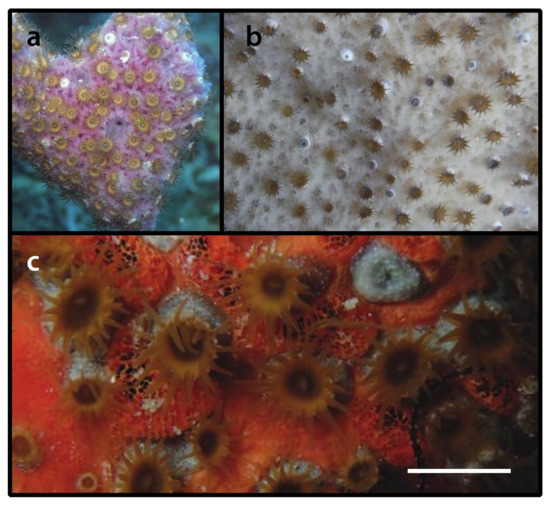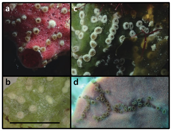 Description as in Duchassaing de Fonbressin & Michelotti [23], West [26], Swain [62]. The colonies present very short polyps forming a chain-like incrustation on the surface of the sponges, with polyps arising from one another by stolons (propagules), not from a common membrane. This species is characterized by having a commensalistic and cateniform habit of colonization (p. 54 translated by Duerden [63] from Duchassaing de Fonbressin & Michelotti [23], also [29]). Polyps and coenenchyme present a golden–brown color, 10 capitular ridges, 20 tentacles with a maximum length of 1 mm, and the same number of mesenteries, the length and diameter of extended polyps is rarely more than 1 mm, and the symbiont sponges belonging to the order Halosclerida [26,62].