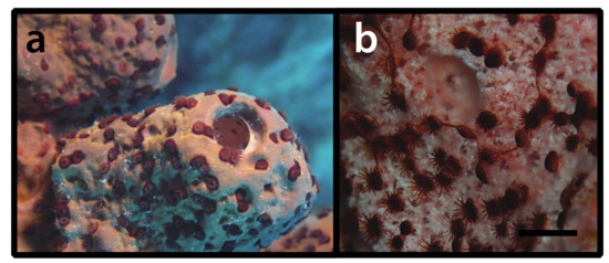 Figure 6. Bergia puertoricense in situ; (a) specimen MISE JDR170609-1-4 from Carmabi, Hilton Hotel [point 53], Curaçao, depth = 20 m, and (b) image (not collected) from Red Slave, Bonaire, depth = 30 m. Scale bar in (b) = approximately 1 cm.