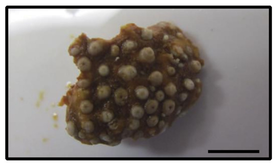 Figure 8. Preserved specimen RMNH.COEL.40264 Parazoanthidae? sp. from north of Piscadera Bay [point 61], Curaçao, depth = unknown. Scale bar = approximately 1 cm.