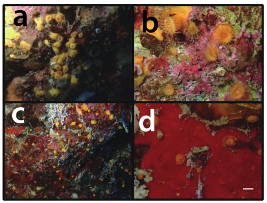 Figure 9. In situ images of Parazoanthus atlanticus sp. n. (a) specimen MISE JDR170613-10-61 from Caracas Bay, Tugboat [point 42], Curaçao, depth = 18 m, (b) specimen MISE JDR170616-13-76 from north of Blue Bay [point 62], Curaçao, depth = 34 m, (c) specimen MISE JDR191103-1-1 from Small Wall [point 14], Bonaire, depth = 16 m, and (d) specimen MISE JDR191103-1-1 from Small Wall, Bonaire, depth = 16 m, with presence of much smaller Umimayanthus sp. Note the small sizes of the colonies formed by P. atlanticus sp. n. and the high frequency of solitary polyps. Scale bar in (d) = approximately 3 mm.