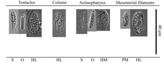 Figure 10. Images of all cnidae categories and average size of found across different tissues in polyps of P. atlanticus sp. n.; S = Spirocysts, O = basitrich & microbasic b-mastigophores, HL = Holotrichs (L), HM = Holotrichs (M), and PM = microbasic p-mastigophores.