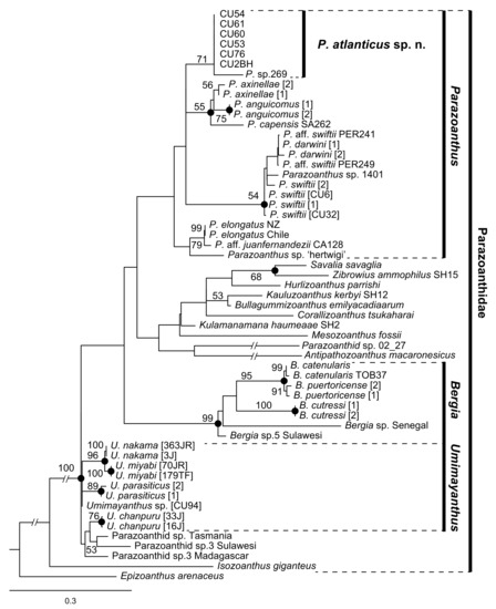 Figure 11. Maximum likelihood (ML) phylogenetic reconstruction using the concatenated alignment of one nuclear DNA region ITS-rDNA, and two mitochondrial regions 16S-rDNA and COI mt-DNA. Values on branches represent bootstrap support >50 from maximum likelihood analyses and black circles indicate Bayesian posterior probabilities >95%. Note the clear monophyly form by P. atlanticus sp. n. in reference to other species in genus Parazoanthus. CU53 = NSMT-Co 1706; CU54 = NSMT-Co 1707; CU60 = MISE JDR170613-10-60; CU61 = MISE JDR170613-10-61; CU76 = MISE JDR170616-13-76; CU2BH = RMNH.COEL.42433; CU6 = MISE JDR170609-2-6; CU32 = MISE JDR170610-4-32; CU94 = MISE JDR170619-20-94.
