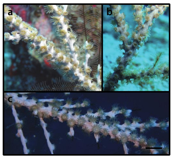 Most specimens in this study were identified by the first or last author between 2012 and 2019. For identification, we focused on external morphological characteristics that are utilizable in the field (e.g., general colony morphology, polyp sizes, tentacle numbers [25,26]). All measurement units were converted to the standard international metric system. The large majority of newly collected specimens in this study were identified via simple morphological and ecological analyses. We additionally conducted molecular phylogenetic analyses for one species that we formally describe in this work; these methods are given below.
