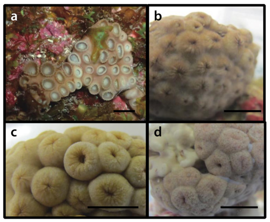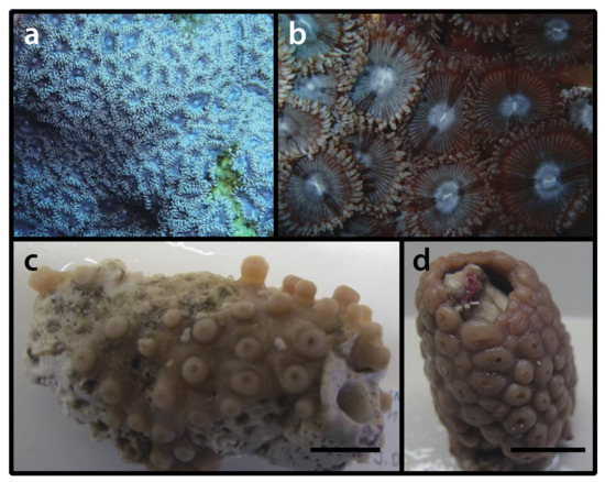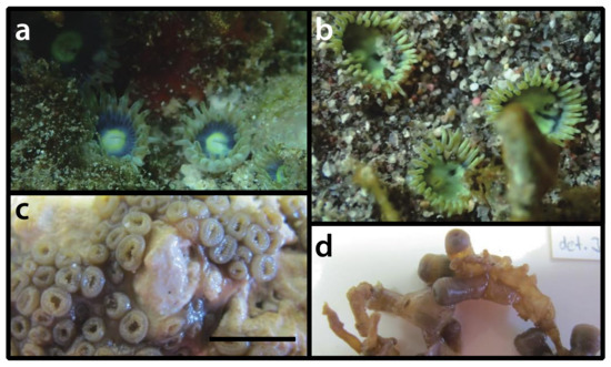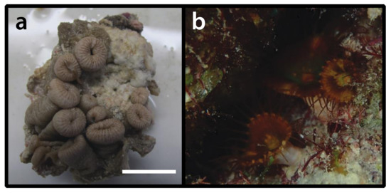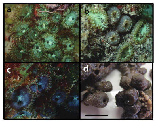 - Reimer, J.D.; Ono, S.; Tsukahara, J.; Iwase, F. Molecular characterization of the zoanthid genus Isaurus (Anthozoa: Hexacorallia) and associated zooxanthellae (Symbiodinium spp.) from Japan. Mar. Biol. 2008, 153, 351–363. [Google Scholar] [CrossRef]