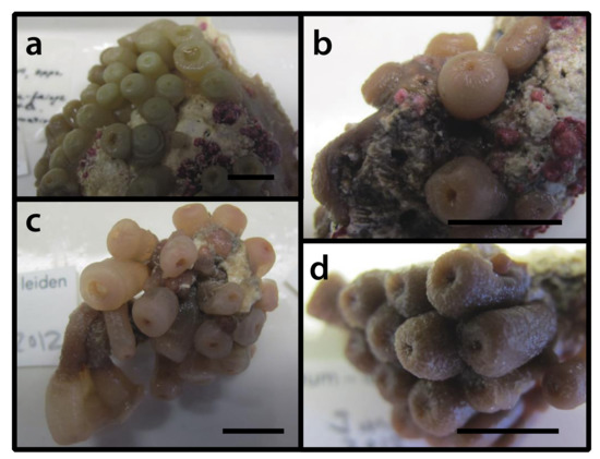 Figure 25. Preserved Zoanthus sp. (a) specimen RMNH.COEL.40234 from southwest coast opposite Lake Goto [point 21], Bonaire, depth = shallow water, (b) specimen RMNH.COEL.40282 from Fuikbaai [point 36], Curaçao, depth = intertidal, (c) specimen RMNH.COEL.40245 from Fuikbaai [point 36], Curaçao, depth unknown, and (d) specimen RMNH.COEL.40328 from Bucuti, south point [point 3], Aruba, depth = intertidal. Scale bars = approximately 1 cm.