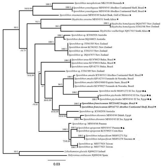 Currently, there are 29 recognized species of Sporolithon worldwide [] from which 12 are recorded in Brazil, namely, S. amadoi [], S. australasicum [], S. durum [], S. elevatum [], S. episoredion [], S. episporum [,], S. erythraeum [], S. howei [], S. molle [], S. pacificum [], S. tenue [], and S. yoneshigueae []. With the exception of S. howei, which has been recorded to form carbonate concretions, all species were reported to occur in Brazilian rhodolith beds [,,,,,,,,]. Among them, only S. amadoi, S. tenue and S. yoneshigueae were assigned based on the analysis of DNA sequences of the type material. The other nine Sporolithon species were determined based on specimens identified using only morpho-anatomical analyses. Thus, some of these names may have been incorrectly applied. In addition, and unfortunately, most specimen collections used for this identification were formalin-preserved and DNA sequencing analysis is likely to be unfruitful. Therefore, investments in new samplings of fresh rhodoliths with suitable storage methods for DNA analysis are required to assess the true diversity of these coralline algae in the SW Atlantic. Recently, several molecular studies have reported the existence of cryptic speciation in Sporolithon, which led to an increase in the number of species of this genus [,,,,]. These studies reinforced that comparative analyses of DNA sequences based on sequences of type specimens is the best way to unequivocally identify non-geniculate coralline algae since the morpho-anatomical characteristics alone can be misleading. However, obtaining diagnostic DNA sequences from type material has been a hard task and the main challenge in the current coralline algae taxonomy, since many attempts in doing it have failed [,].