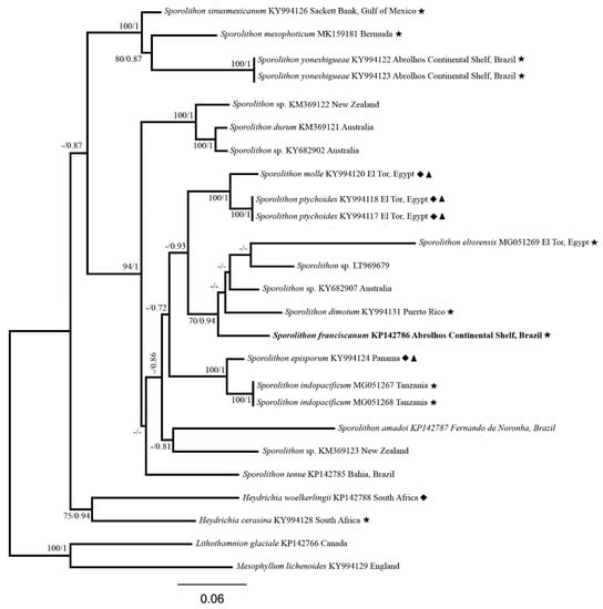 Phylogenetic tree inferred from RAxML and BI analyses of the rbcL dataset. Bootstrap support (1000 replicates) and Bayesian posterior probabilities (PP) are indicated at nodes. Bootstrap values lower than 70% and PP lower than 0.70 are not shown. Lithothamnion glaciale and Mesophyllum lichenoides were used as outgroups. Sporolithon franciscanum sp. nov. is marked in boldface type. Stars represent holotype, isotype, neotype, or paratype specimens; diamonds represent topotype specimens (specimens from the type locality); triangles represent species whose identification was confirmed by comparison of DNA sequences with type material.