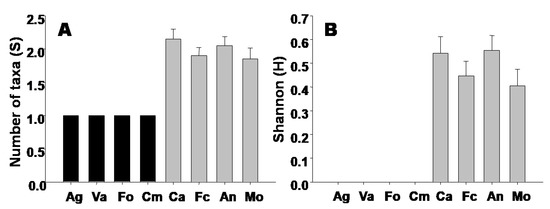 Values (+SE) of (A) number of taxa and (B) Shannon index for all the studied rocky shores: Aguda (Ag), Valadares (Va), Foz (Fo), Cabo do Mundo (Cm), Carreço (Ca), Forte do Cão (Fc), Âncora (An) and Moledo (Mo).
