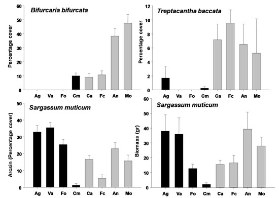 - Sales, M.; Cebrian, E.; Tomas, F.; Ballesteros, E. Pollution impacts and recovery potential in three species of the genus Cystoseira (Fucales, Heterokontophyta). Estuar. Coast. Shelf Sci. 2011, 92, 347–357. [Google Scholar] [CrossRef]