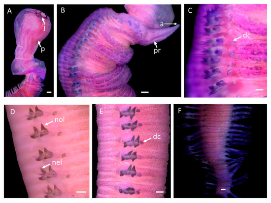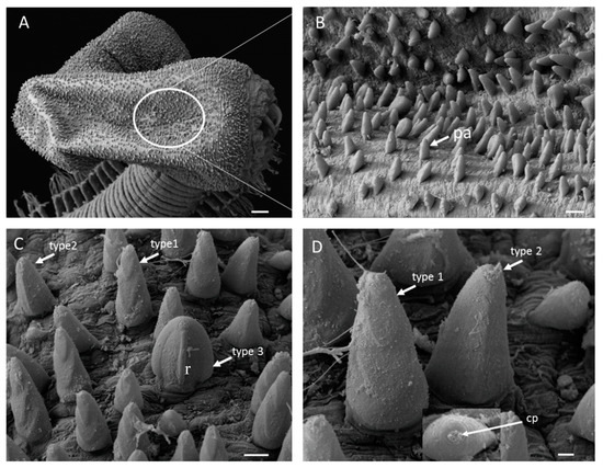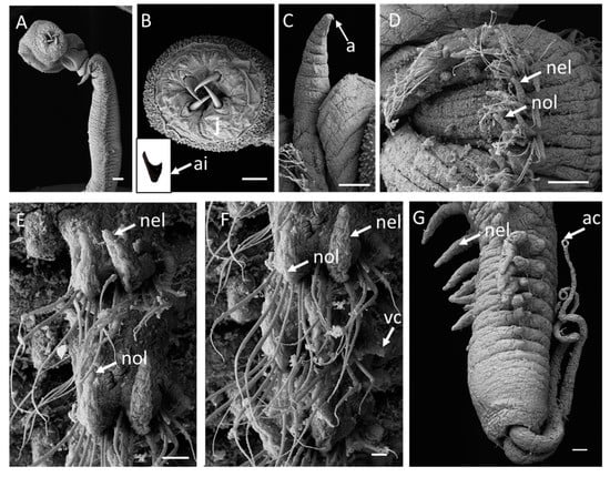 - Fiege, D.; Boggemann, M. Scanning electron microscopy of the proboscidial papillae of some European Glyceridae. Bull. Mar. Sci. 1997, 60, 559–563. [Google Scholar]