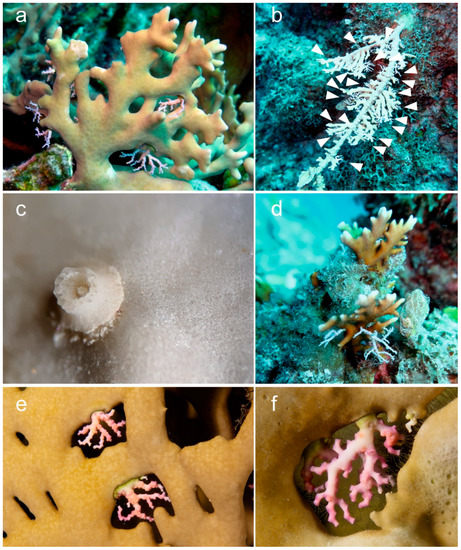 Furthermore, it would be intriguing to investigate the advantages of S. roseus in colonizing M. alcicornis. In fact, despite the fact that this fire coral species has many different growth morphologies [42,43] (Figure S2a,b), with branches often becoming anastomose (Figure S2c) and crucial in providing many different places where S. roseus may settle, the higher growth rate of M. alcicornis [44] may also results in a total overgrowth of S. roseus colonies (Figure S2d).