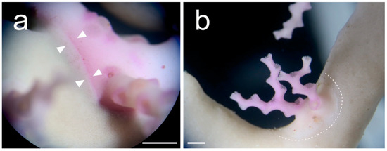 (a) Apparently healthy tissue of both partners when intimately close, and (b) the undefined borders/edges between the two hydrocorals’ tissues. (Scale bars ~ 2 mm).