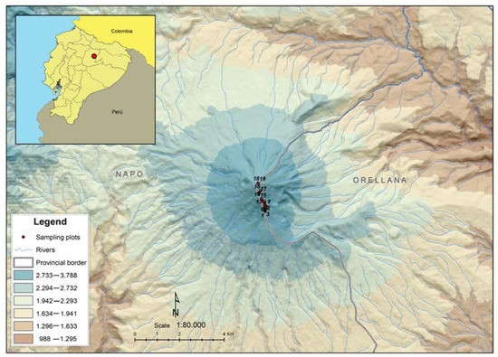 The study was conducted within the Sumaco Napo—Galeras National Park (PNSNG), in the core area of the Sumaco Biosphere Reserve, which is located in the northeastern area of the Ecuadorian Amazon, between the provinces of Napo, Francisco de Orellana and Sucumbíos (Figure 1). The Sumaco volcano culminates at 3800 m above sea level (m a.s.l.), which is part of the sub-Andean volcanic cordillera and has been discovered and first described just a century ago [46,47,48,49]. It is located at approximately 105 km southeast of the city of Quito and 35 km northwest of Loreto, which is the nearest village in the Orellana province.