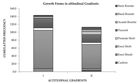 The lifeforms that indicate a significant difference in frequency between gradients are the cushions (Table 2, Figure 5), the basal rosettes, and the stem rosettes, which are more frequently in community II at higher altitudes. The rest of the lifeforms lack the presentation of significant differences throughout the two communities.