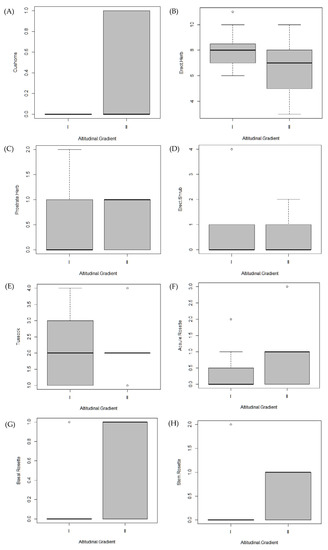 All Lifeforms’ plant boxplot by altitudinal gradients. The altitudinal gradients are plotted versus (A) Cushion; (B) Erect Herb; (C) Prostrate Herb; (D) Erect. Shrub; (E) Tussock; (F) Acaulescent Rosette; (G) Basal Rosette; (H) Stem Rosette.